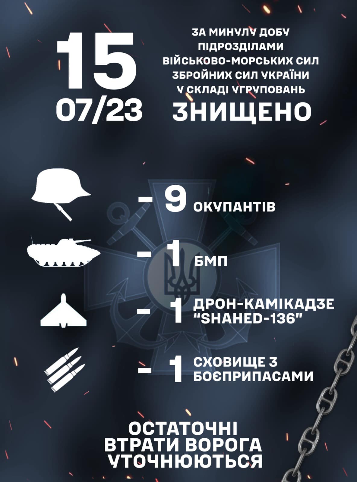 «Військовослужбовці військових частин та підрозділів Військово-Морських Сил Збройних Сил України, які входять до складу угруповань продовжували виконувати завдання щодо відсічі повномасштабної збройної агресії російської федерації. Минулої доби, підрозділами ВМС ЗС України знищено 9 окупантів, 1 бойову машину піхоти, 1 дрон-камікадзе „Shahed-136“ та 1 сховище з боєприпасами. Остаточні втрати ворога уточнюються», — йдеться у повідомленні.