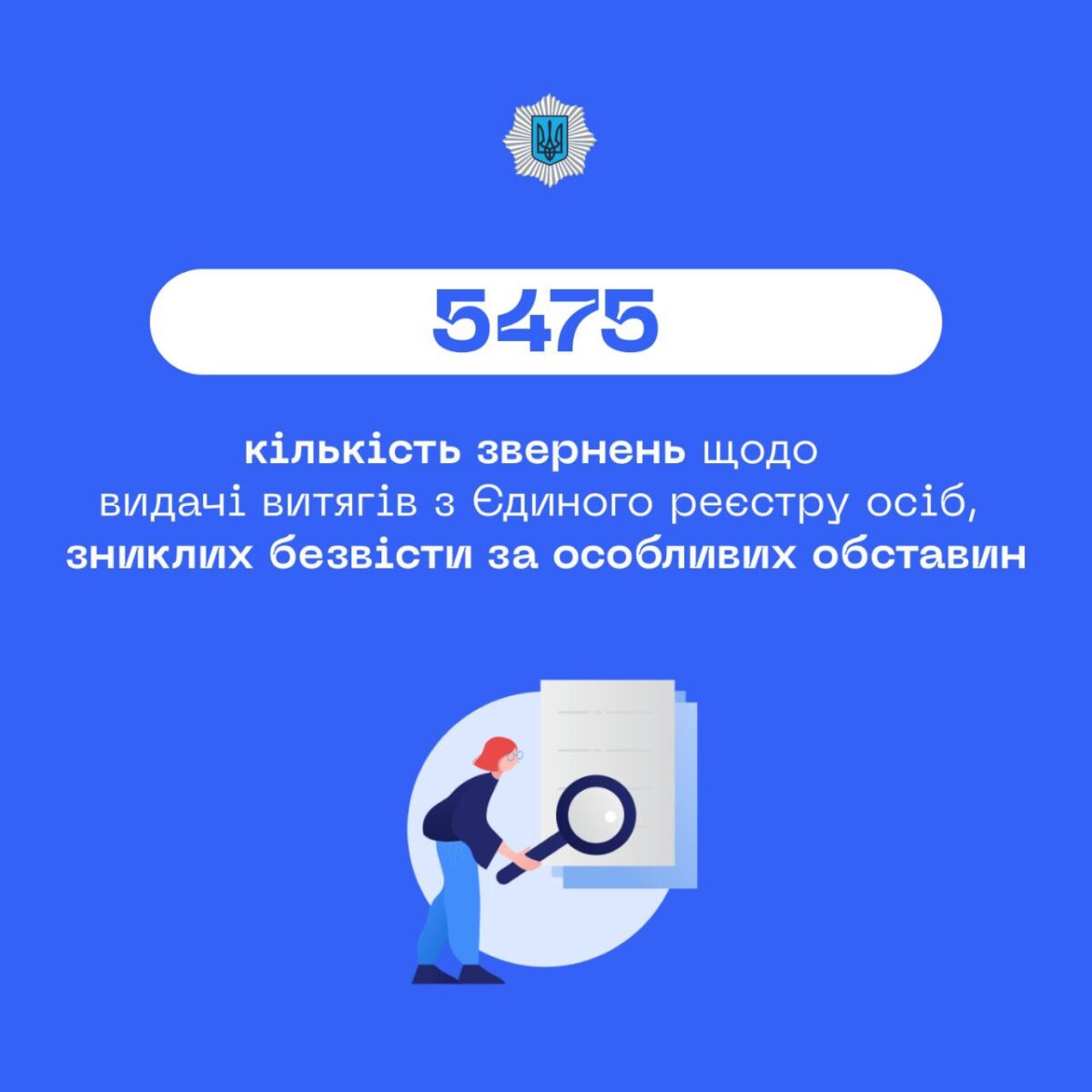 Міністерство внутрішніх справ України на урядовому порталі повідомило, що з початку роботи Єдиного реєстру осіб, зниклих безвісти за особливих обставин, було зареєстровано 5475 звернень щодо видачі витягів.