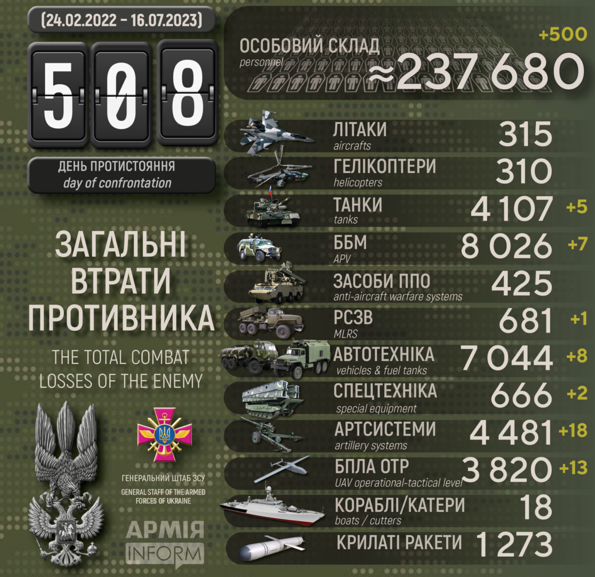 Загальні бойові втрати противника з 24.02.22 по 16.07.23 орієнтовно становлять: