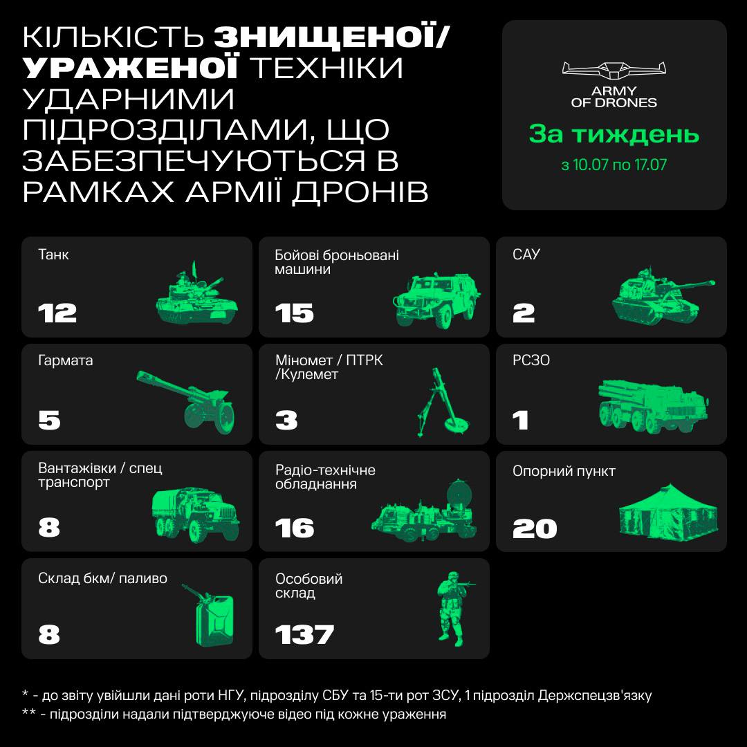 «Мінус 12 танків, 15 бойових броньованих машин та ще 35 одиниць різного обладнання в росіян завдяки нашим „пташкам“. Детальний звіт втрат ворога за тиждень — на інфографіці. Маємо відеопідтвердження кожної цифри.