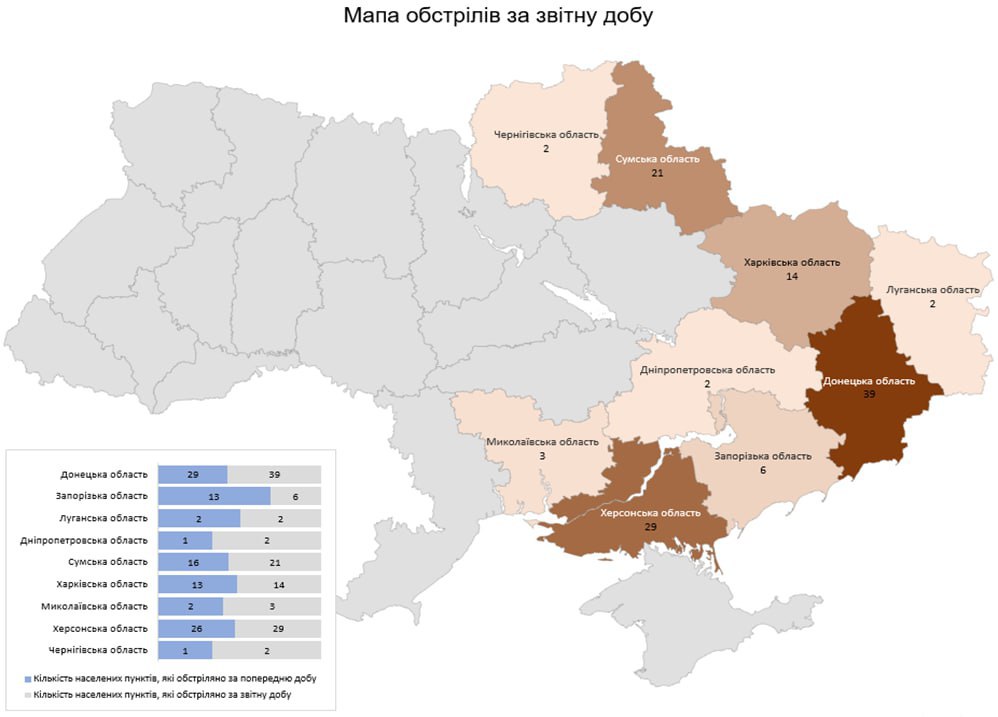Із різних видів озброєння — стрілецька зброя, гранатомети, міномети, танки, артилерія, РСЗВ, ЗРК, ударні БПЛА та тактична авіація — були атаковані 118 населених пунктів та 92 об’єкти інфраструктури.