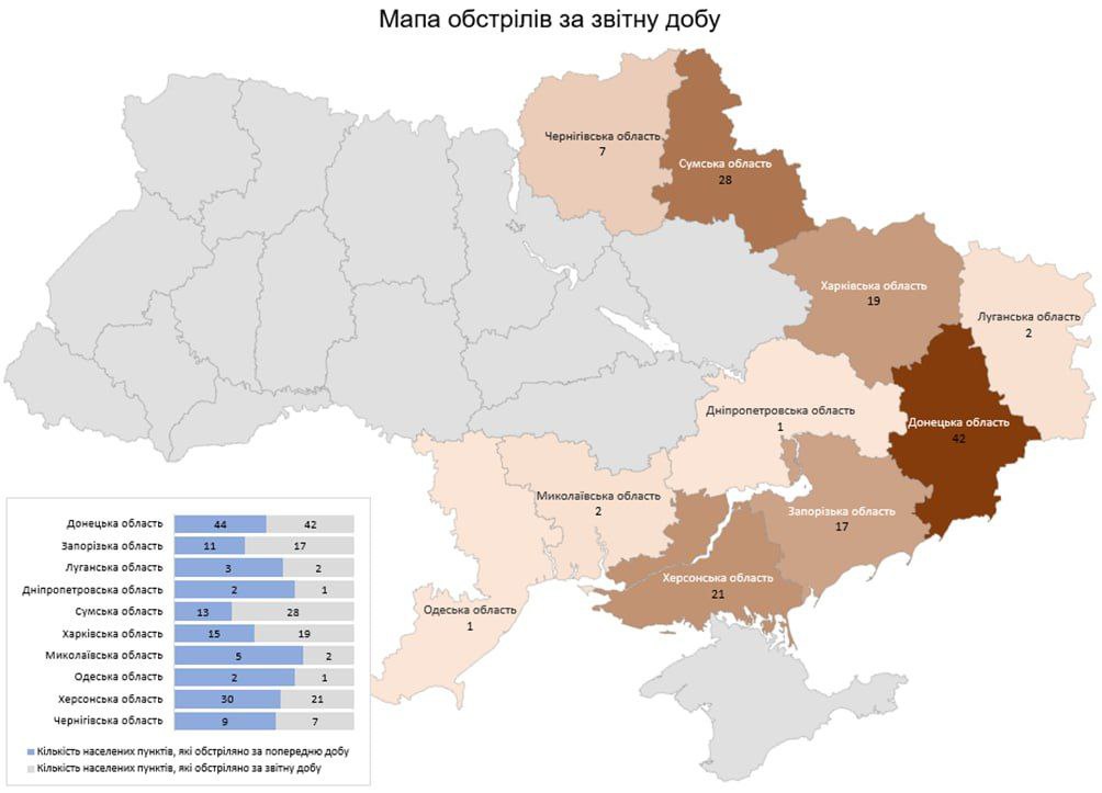 «Із різних видів озброєння — стрілецька зброя, гранатомети, міномети, танки, артилерія, РСЗВ, ЗРК, БПЛА, тактична авіація та кораблі чф — було атаковано 140 населених пунктів та 101 об’єкт інфраструктури», — йдеться у повідомленні.