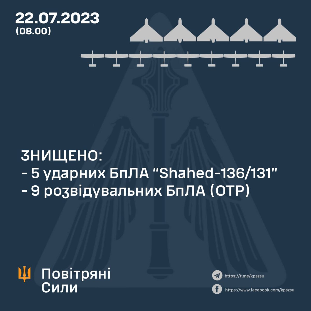 «Уночі 22 липня 2023 року російські окупанти атакували з південно-східного напрямку п’ятьма ударними дронами „Shahed-136/131“. Силами та засобами протиповітряної оборони Повітряних Сил усі 5 дронів-камікадзе знищено!», — йдеться у повідомленні