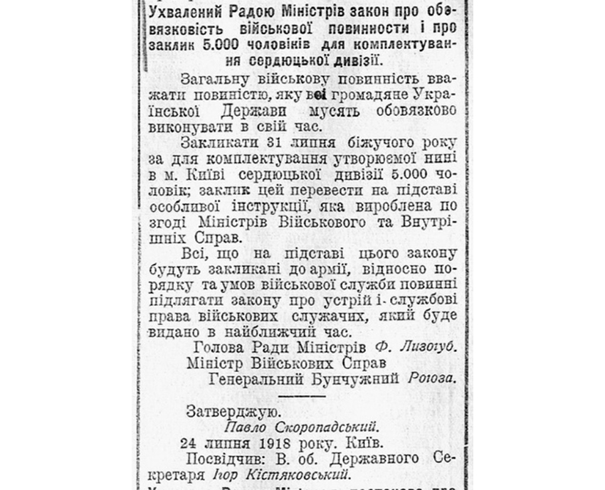 105 років тому, 24 липня 1918 року, гетьман Павло Скоропадський затвердив закон про загальну військову повинність. Закон стверджував, що всі громадяни Української Держави зобов’язані «у свій час» військово послужити Україні.