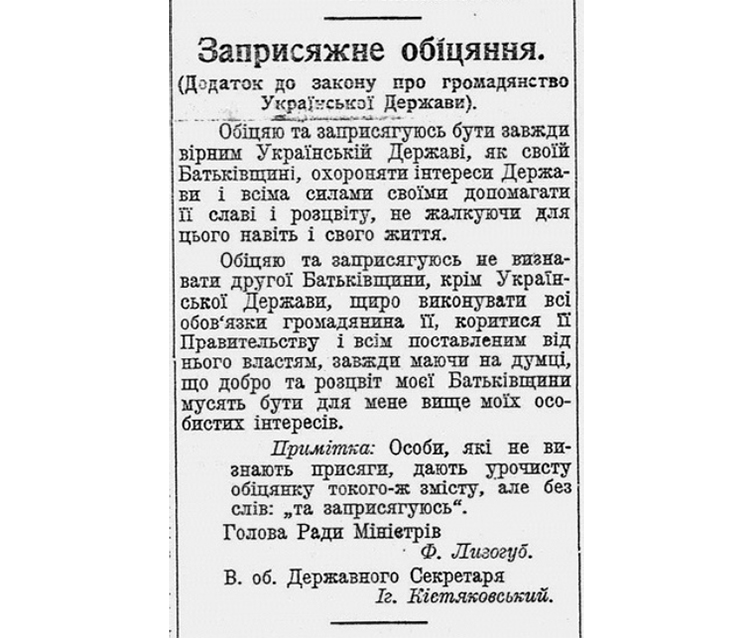 «Заприсяжне обіцяння», яке було додатком до закону про громадянство Української Держави, починалось словами: