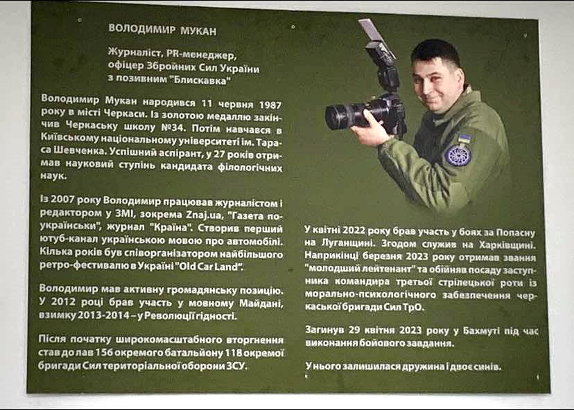 «Миті війни» — під такою назвою відкрито фотовиставку зі світлинами, які зробив лейтенант окремої бригади територіальної оборони 35-річний Володимир Мукан, який був родом із Черкащини та героїчно загинув 29 квітня цього року під Бахмутом.
