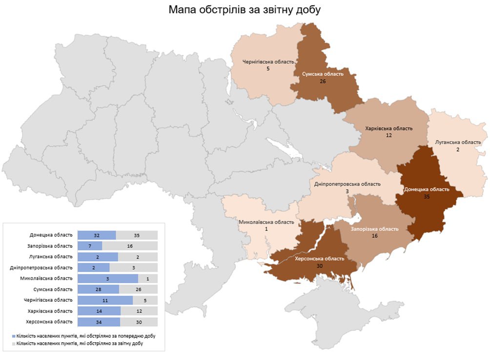 Із різних видів озброєння — міномети, танки, ствольна артилерія, РСЗВ, ЗРК, БПЛА, тактична авіація — були атаковані 130 населених пунктів та 91 об’єкт інфраструктури.