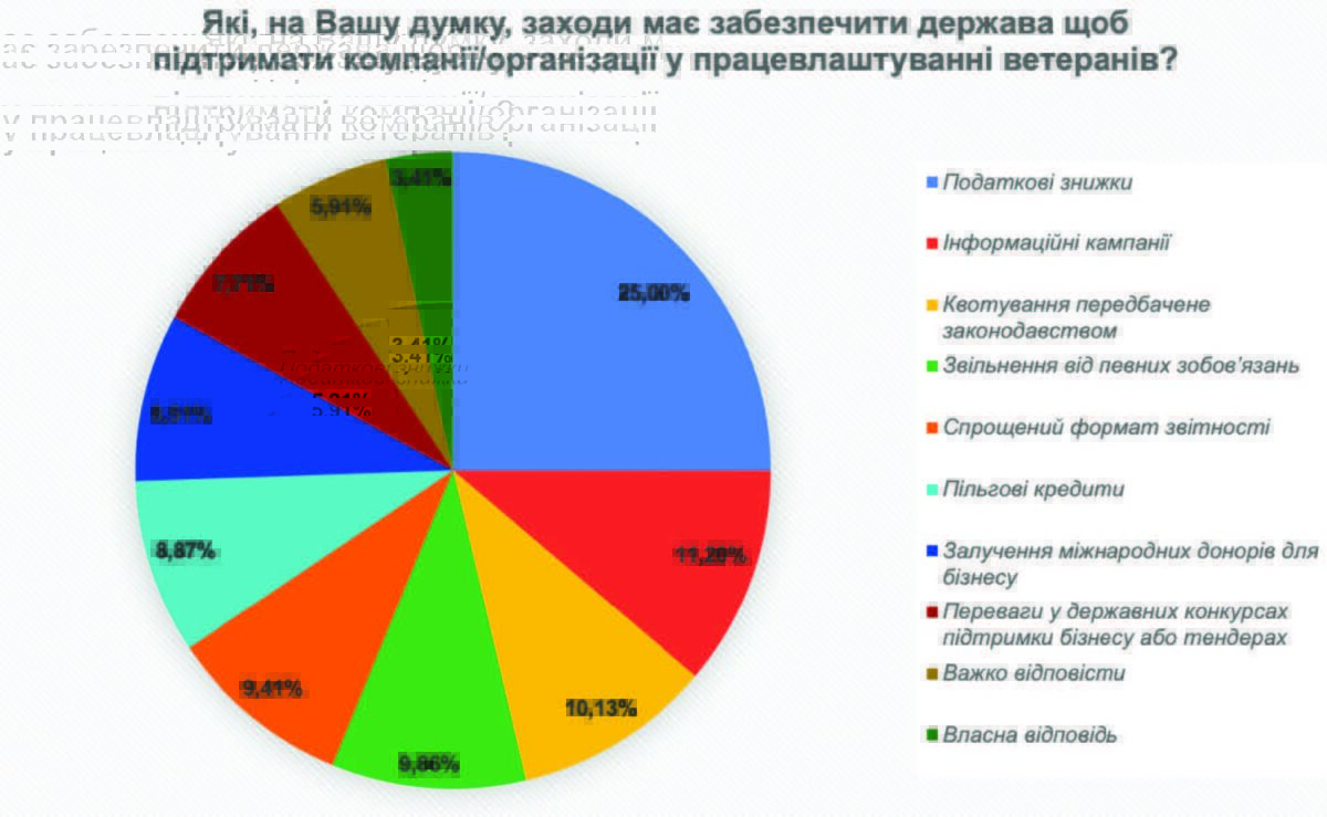 Водночас через війну економічна ситуація досить складна, значний рівень безробіття, існує великий тіньовий ринок праці та приховані трудові відносини. Тому не йдеться про преференції для бізнесу у зв’язку з працевлаштуванням ветеранів. На цьому наголосила під час презентації дослідження перший заступник виконавчого директора Українського ветеранського фонду Мінветеранів Руслана Величко-Трифонюк.