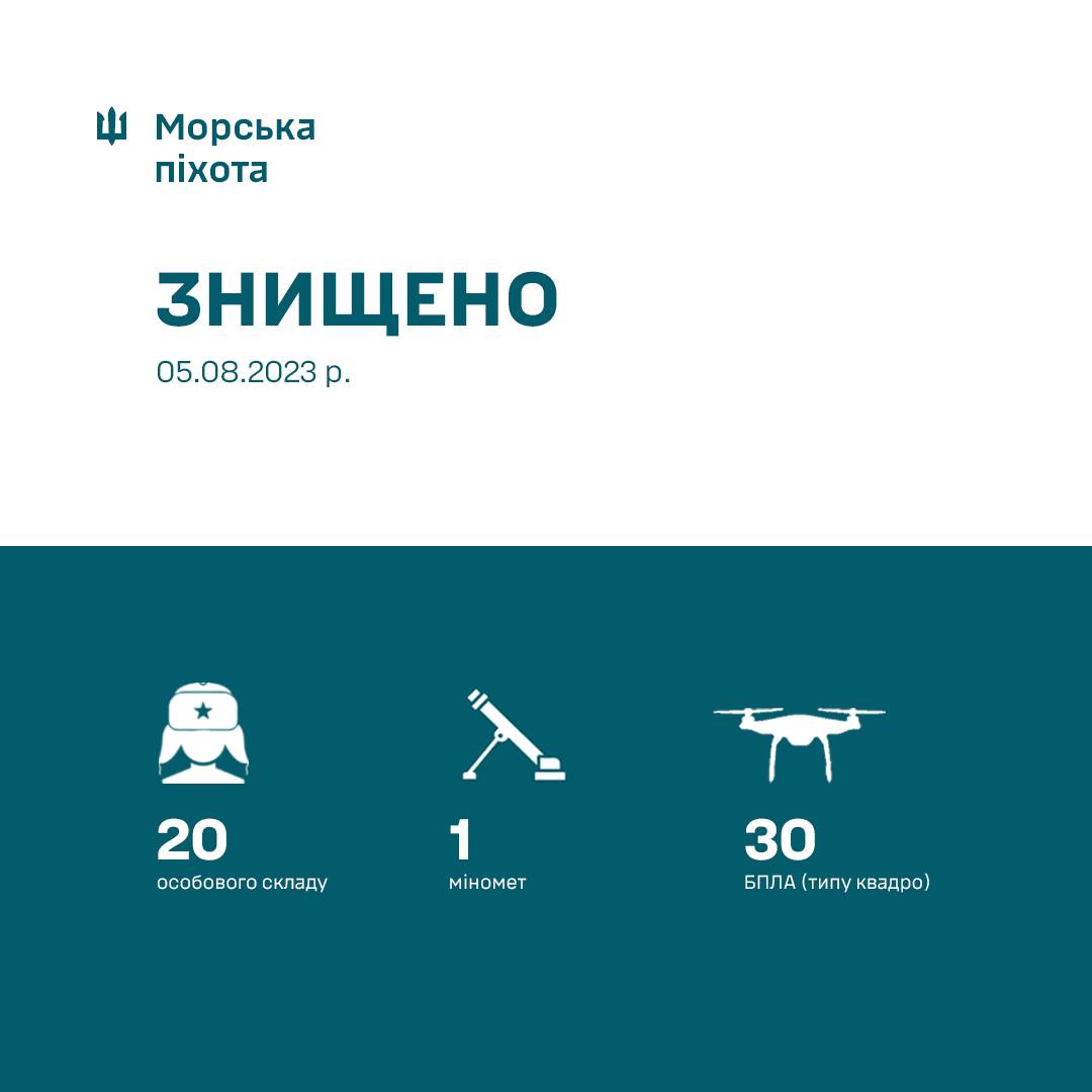 Минулої доби, 5 серпня 2023-го, морські піхотинці з 35-ї окремої бригади морської піхоти імені контрадмірала Михайла Остроградського знищили 3 окупантів. Воїни 36-ї окремої бригади морської піхоти імені контрадмірала Михайла Білинського знищили 4 російських військових. Особовий склад 38-ї окремої бригади морської піхоти знищили БПЛА типу квадро. Воїни-артилеристи 406-ї ОАБр імені генерал-хорунжого Олексія Алмазова знищили 13 загарбників та міномет.