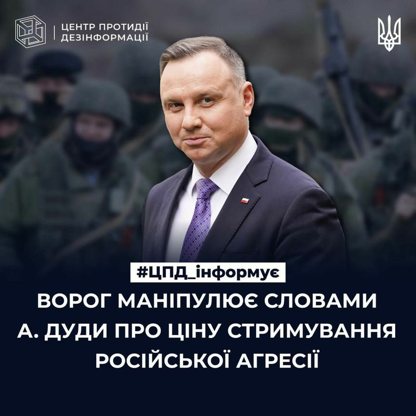 Ворожі TG-канали маніпулюють словами президента Польщі Анджея Дуди про те, що нібито українські втрати на війні — це «дешева ціна».
