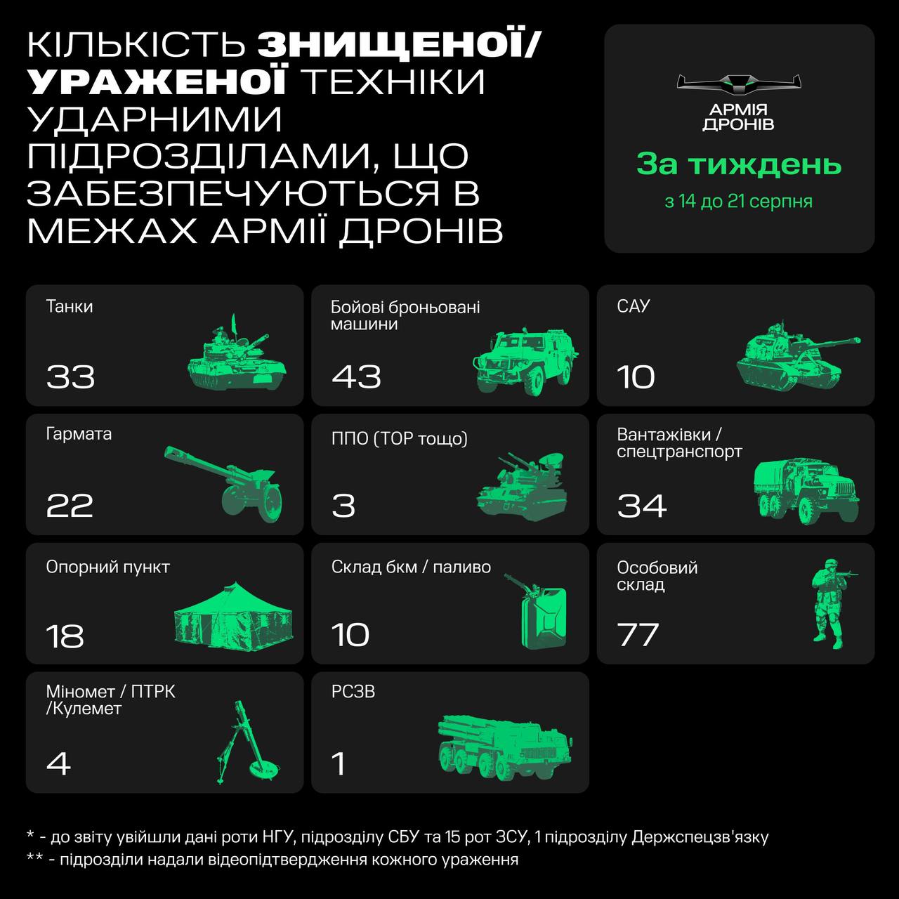 «Армія дронів продовжує перетворювати російську техніку на брухт — результати за тиждень. Продовжуємо фіксувати втрати ворога від „пташок“ з Армії дронів. Щоб закарбувати результати ударних рот БПЛА та підтримати воїнів, які боронять нашу країну 24/7. Протягом тижня військові за допомогою дронів уразили 33 танки, 43 броньовані машини, 34 вантажівки, 18 опорних пунктів та 10 складів з пальним і боєприпасами. Більше деталей роботи — на інфографіці. Важливо, що на кожну цифру є відео, яке підтверджує враження техніки та позицій. Дякую кожному, хто працює на перемогу. Якщо у нас плюс, у росіян мінус», — пише високопосадовець.