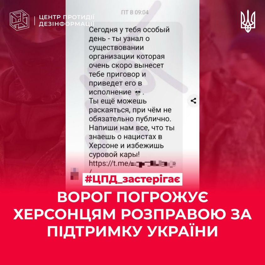 Центр закликає не піддаватись маніпуляціям. Нагадуємо, що будь-яка співпраця з ворогом прирівнюється до державної зради і в умовах воєнного стану карається позбавленням волі строком до 15 років або довічним увʼязненням.