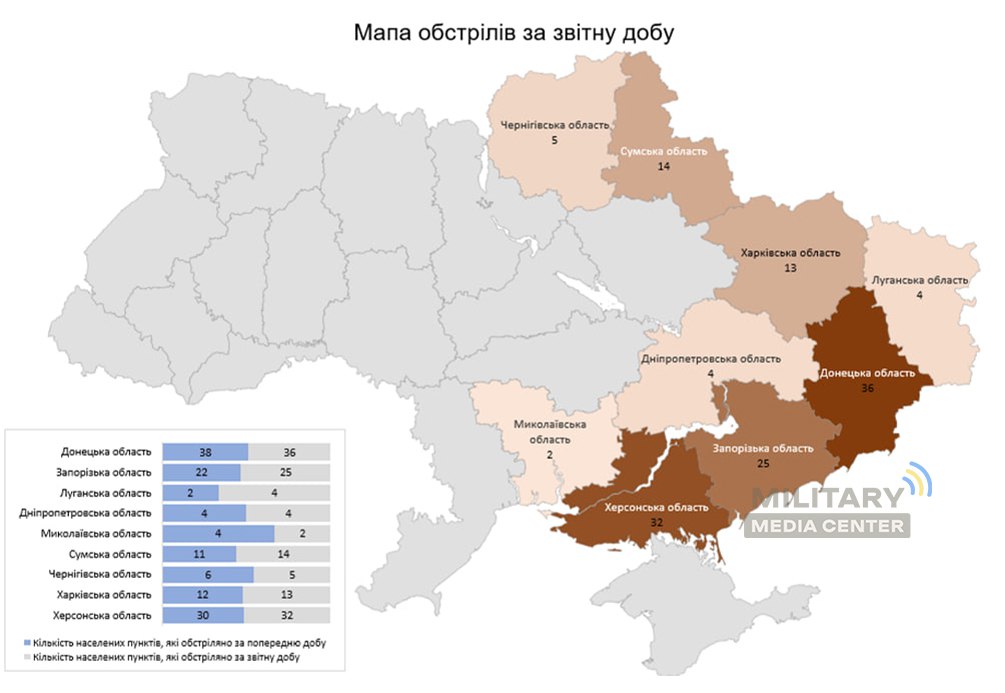 Загалом з різних видів озброєння — гранатомети, міномети, танки, артилерія, РСЗВ, БПЛА, ОТРК, тактична авіація — були атаковані 135 населених пунктів та 81 об’єктів інфраструктури.
