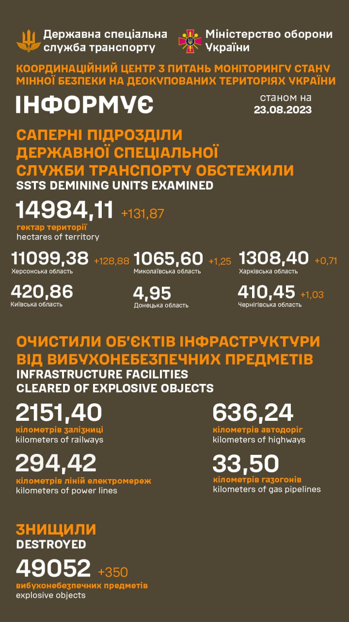 «Координаційний центр з питань моніторингу стану мінної безпеки на деокупованих територіях України інформує, що станом на 23.08.2023 саперні підрозділи Державної спеціальної служби транспорту обстежили 14984.11(+131.87) га та знищили 49052 (+350) вибухонебезпечних предметів», — зазначається у повідомленні.