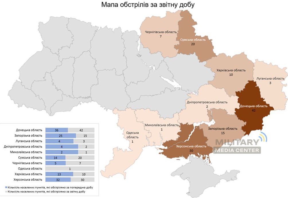 Із різних видів озброєння — гранатомети, міномети, танки, артилерія, РСЗВ, БПЛА, ЗРК, тактична авіація — були атаковані 131 населений пункт та 40 об’єктів інфраструктури.