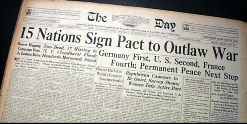 95 років тому, 27 серпня 1928 року, 15 держав підписали у Парижі Загальний договір про відмову від війни як інструменту національної політики. Провідними ініціаторами розробки і ухвалення цього документа стали Франція та США в особі міністра закордонних справ Французької республіки Арістида Бріана та державного секретаря Сполучених Штатів Америки Френка Келлоґа. У день укладання документ підписали 15 держав, а згодом до нього приєднались ще 47.