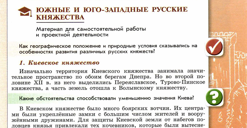 Чому і як саме сталося так, що ті землі, які були «серцевинними» у викладі історії росії ІХ-ХІ століть раптом перетворились у ХІІ-ХІІІ століттях на периферійні «південні та південно-західні руські» Київське, Чернігівське, Галицько-Волинське князівства також зрозуміти годі. Школяр має прийняти як факт, що спочатку головна історія росії відбувалась у Києві, а потім почалася феодальна розробленість і головним чомусь стало Володимиро-Суздальське князівство й почасти Новгородська республіка. Чому головними? Бо їм у підручнику присвячено окремі обов’язкові параграфи, тоді як історію «південних та південно-західних руських князівств» віднесено до самостійного опрацювання. Про те, що тепер це територія не російської федерації, а сусідньої суверенної держави Україна, також не згадується.