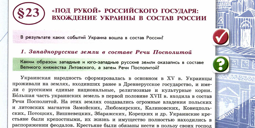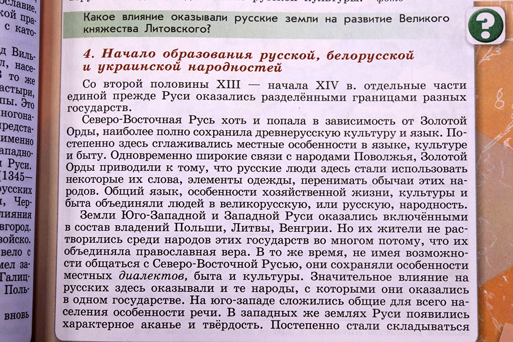 На жаль, цим кривеньким і спотвореним ідеєю існування давньоруської народності визнанням усе й завершується — далі про України згадують лише як про частину «ісконно» російських земель та об’єкт російської політики. Українські землі від середини XIV століття позиціонуються у підручнику для російських шестикласників як «захоплені Литвою», тому їх будь-що необхідно приєднати до росії. При цьому авторів традиційно абсолютно не обходить питання, що про це думали самі мешканці України.