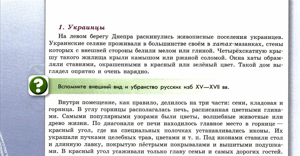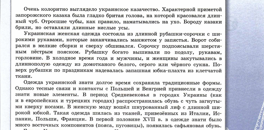 Слід зазначити, що саме підручник для 8-го класу містить найбільше пунктів, присвячених Україні, й принаймні частина наведеної в них інформації в цілому не суперечить історичним реаліям, а сам виклад прихильний до українців. Найкраще авторам вдаються розділи з етнографічними деталями, хоча вони й не позбавлені усталених помилок та міфів. І це не дивно — як суто етнографічне явище українці в контексті російської історії цілком прийнятні й навіть бажані.