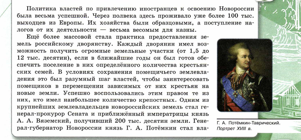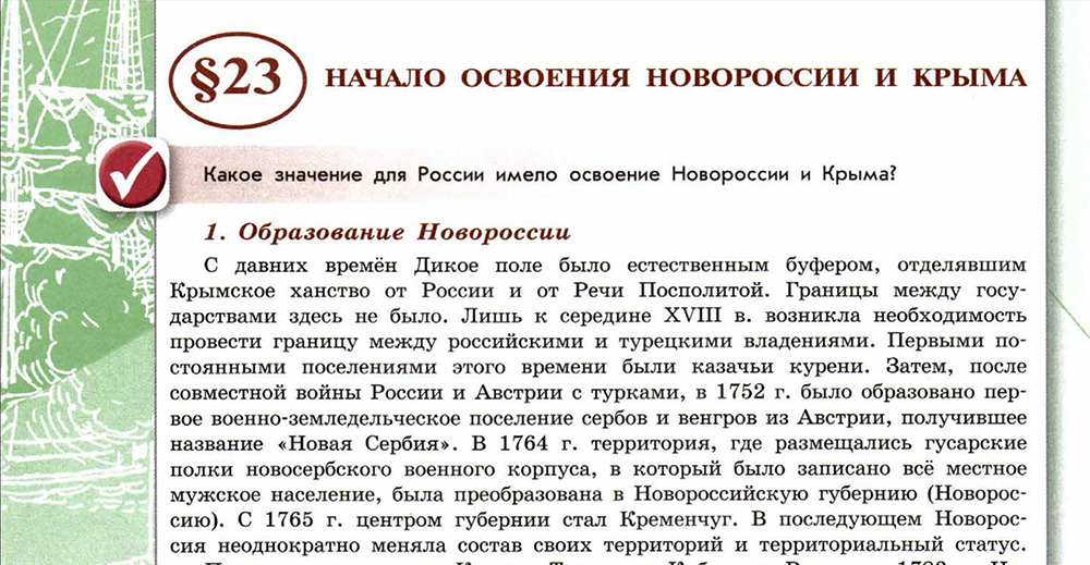 Після ліквідації гетьманату Україна й українці надовго практично повністю зникають зі сторінок російських підручників з історії для 8-го й 9-го класів. Показовим є параграф «Начало освоения Новороссии и Крыма» (8 клас), який подає колонізацію південноукраїнських степів виключно з позицій російського самодержавства. У ньому приділено чимало уваги заходам уряду із залучення іноземних переселенців, однак не знайшлося місця ні характеристиці трагедії кримських татар після знищення їхньої національної держави Кримського ханату, ані жодній згадці про українців, які були головною рушійною силою господарського освоєння регіону.