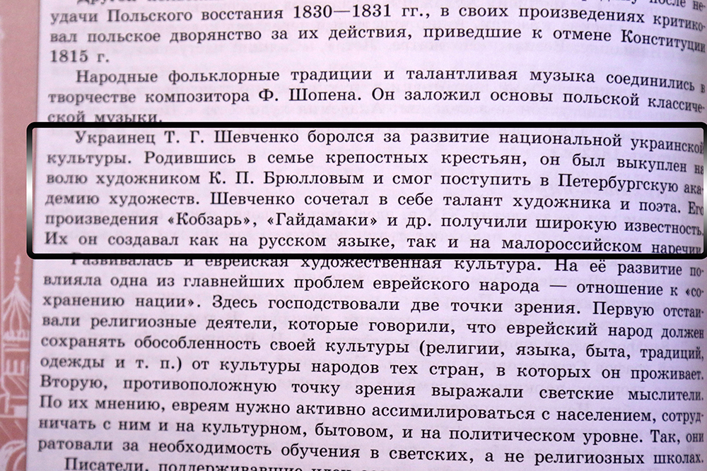 Навіть говорячи про творчість Тараса Шевченка, який став символом українського національного відродження, автори підручника примудряються максимально його «денацифікувати», русифікувати й узагалі зробити комфортним для сприйняття росіянами через інтеграцію митця до російського імперського простору: