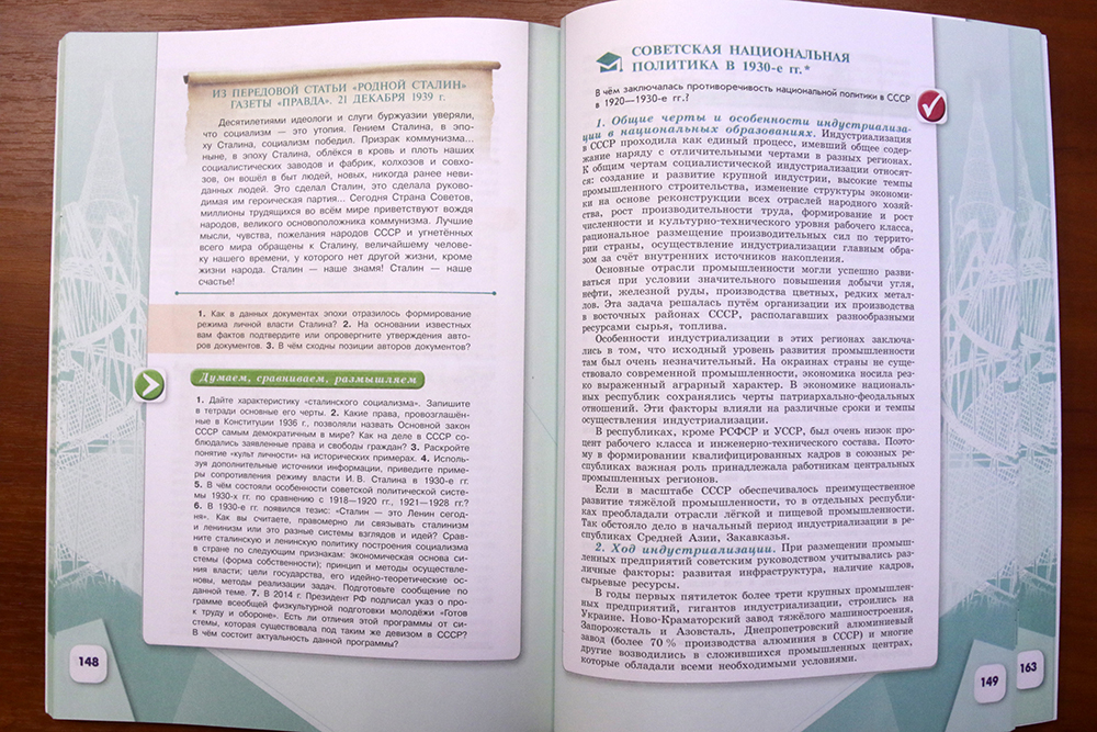 З усього видно, що національні, й особливо українські питання, автори підручника сприймають хворобливо й упереджено. Наприклад, пишучи про політику коренізації, вони прямим текстом визнають, що вона була вимушеним тимчасовим кроком, оскільки більшовикам необхідно було здобути підтримку місцевої національної інтелігенції: «Советская власть не могла в этот период обойтись без местной интеллигенции, которую она привлекала на свою сторону». Однак далі, визнаючи небувалий розквіт в УСРР української мови та культури й зазначаючи, що в процесах коренізації брав участь навіть «націоналіст» Михайло Грушевський, автори не приховують свого негативного ставлення до наслідків українізації, оскільки вона буцімто призвела до утисків росіян: