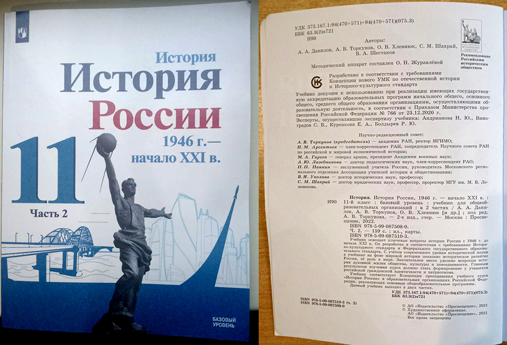 Підручники з російської історії, за якими окупанти та колаборанти планували навчати українських школярів, датовані 2022 роком, однак у їхніх вихідних даних зазначено, що це вже друге, стереотипне видання. Перше ж видання з’явилось ще 2016 року й було підготовлене після окупації українського Криму. Про це свідчить наявність в останньому за хронологією підручнику пункту про окупацію півострова, чи, як її називають автори, «воссоединение Крыма и Севастополя с Россией».