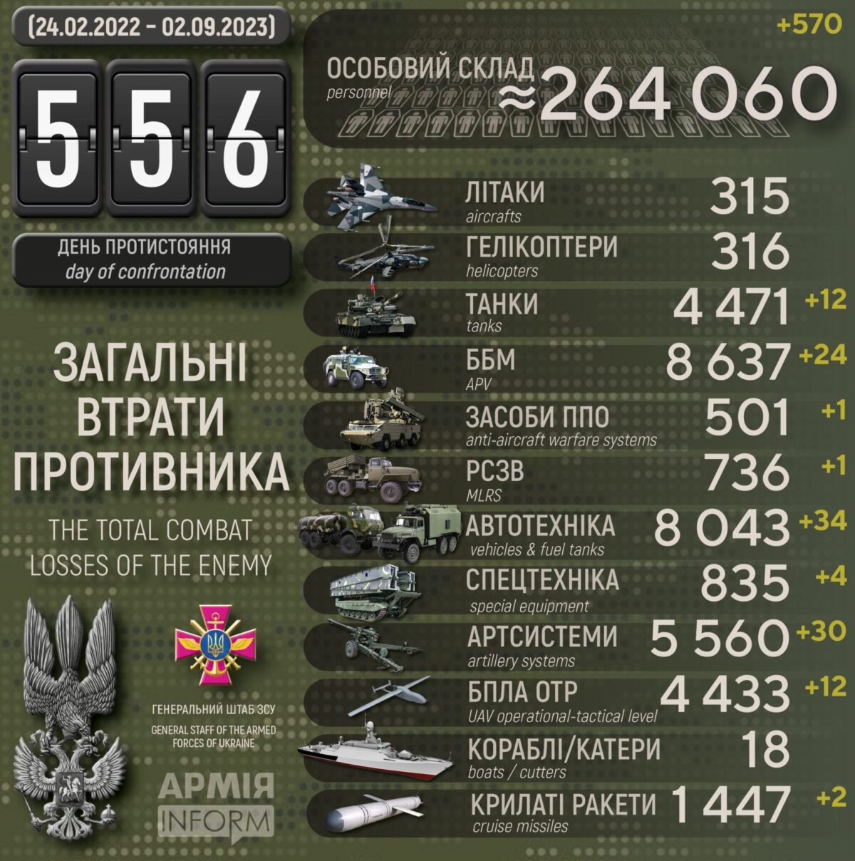 Загальні бойові втрати противника з 24.02.22 по 02.09.23 орієнтовно становлять: