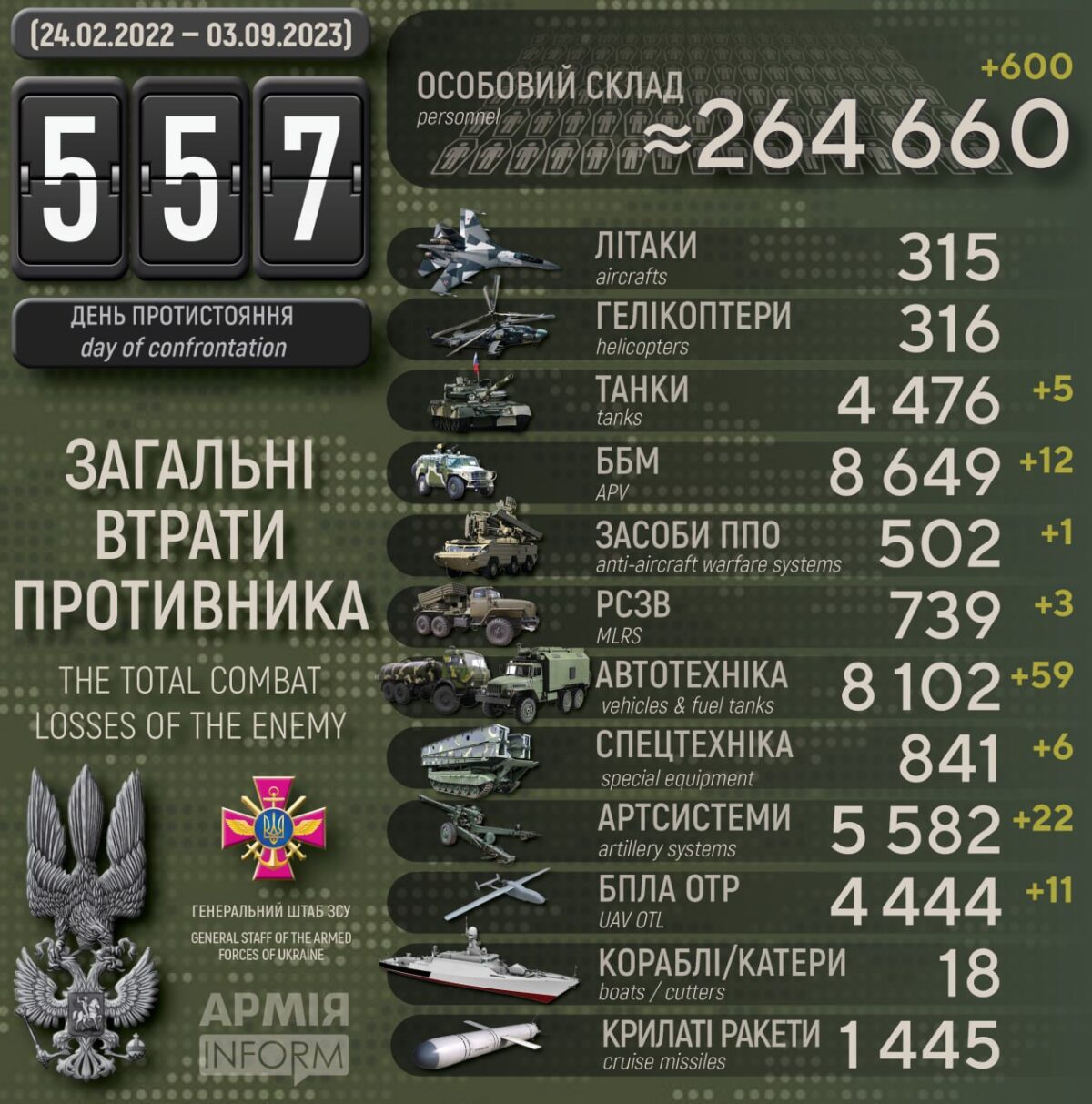 Загальні бойові втрати противника з 24.02.22 по 03.09.23 орієнтовно становлять: