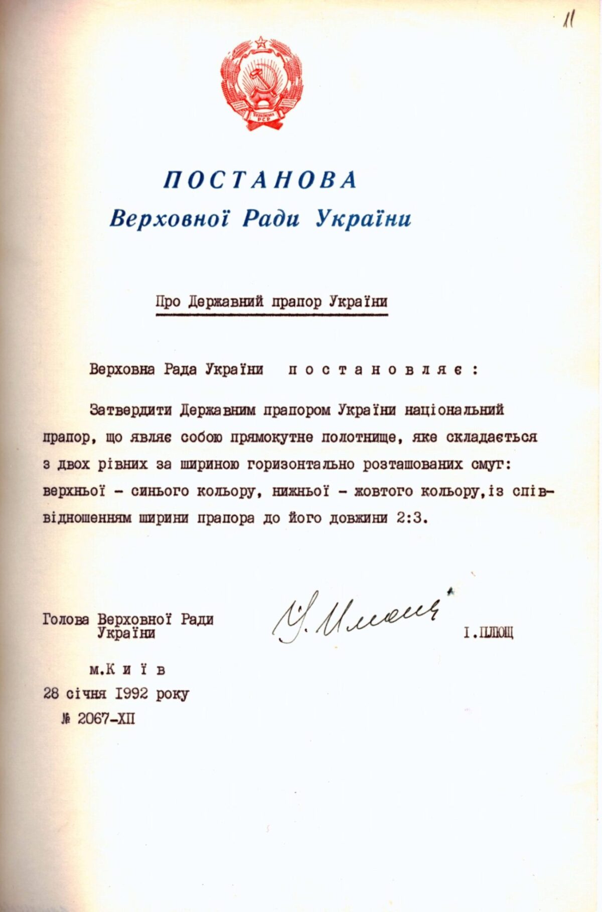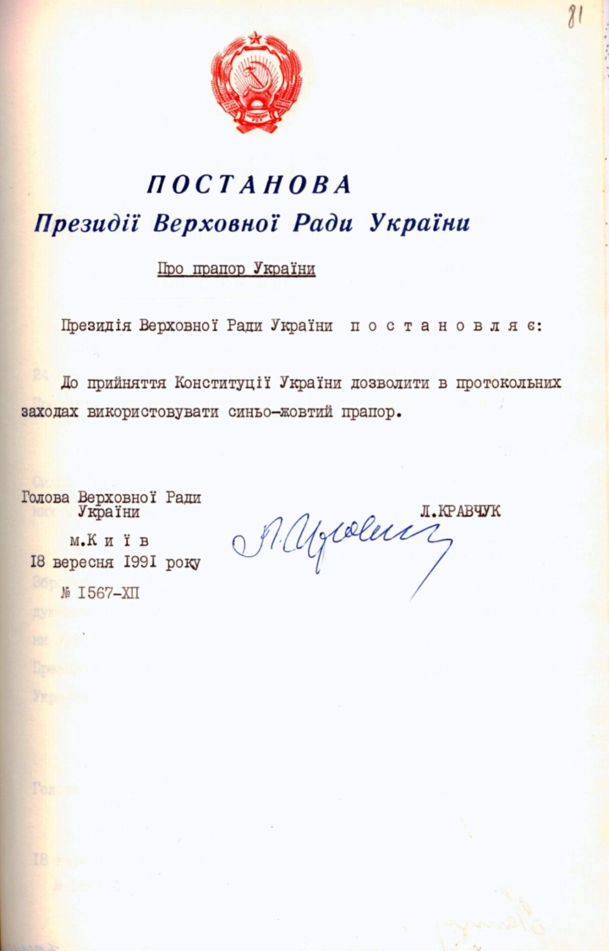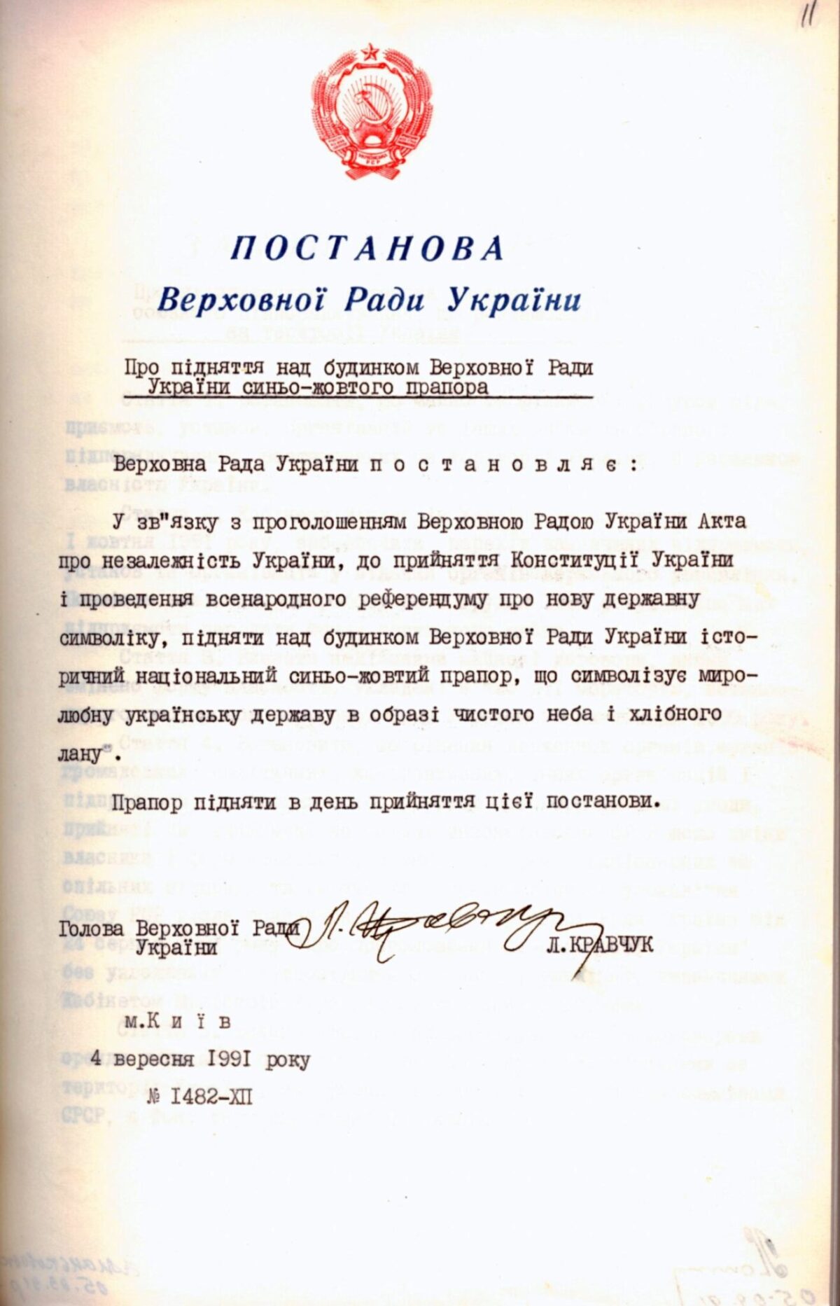 Сьогодні в це важко повірити, але ще десять днів після проголошення Незалежності Україна продовжувала жити під радянським прапором. Хоча підняти синьо-жовтий стяг над куполом Ради і проголосувати за постанову щодо національного прапора було запропоновано ще 24 серпня 1991-го. Це підтверджує стенограма засідання позачергової сесії Верховної Ради: