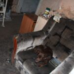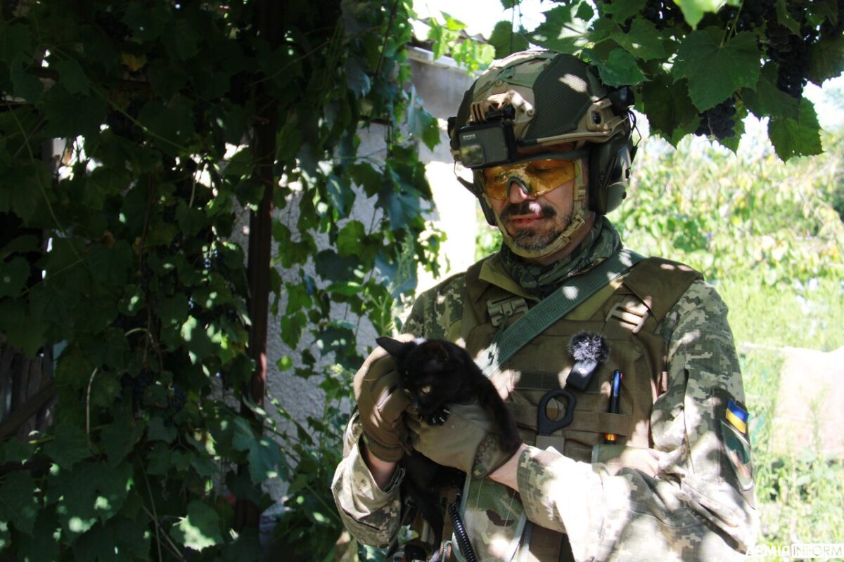 На одній з вулиць наша мобільна пресгрупа почула якесь нявкання та, трохи наблизившись, виявила на подвір’ї будинку маленьке кошеня. Яким чудом воно тут опинилося, досі незрозуміло, але ми забрали його з небезпечного місця з собою. Ймовірно його, як й собаку, яку ми знайшли в іншому будинку, покинули під час відступу росіяни. До речі, таких очей у собаки я ще не бачив жодного разу у житті. Знаходячись у зруйнованому будинку, у повній темряві вона абсолютно байдуже відреагувала спочатку на світло мого ліхтаря, а потім й на спалах фотокамери. Не ворухнулася вона зі свого місця й тоді, коли ми почали оглядати підземне укриття, яке росіяни обладнали собі прямо у будинку, заваливши для цього одну з кімнат сміттям та викопавши до неї підземний лаз із іншої.