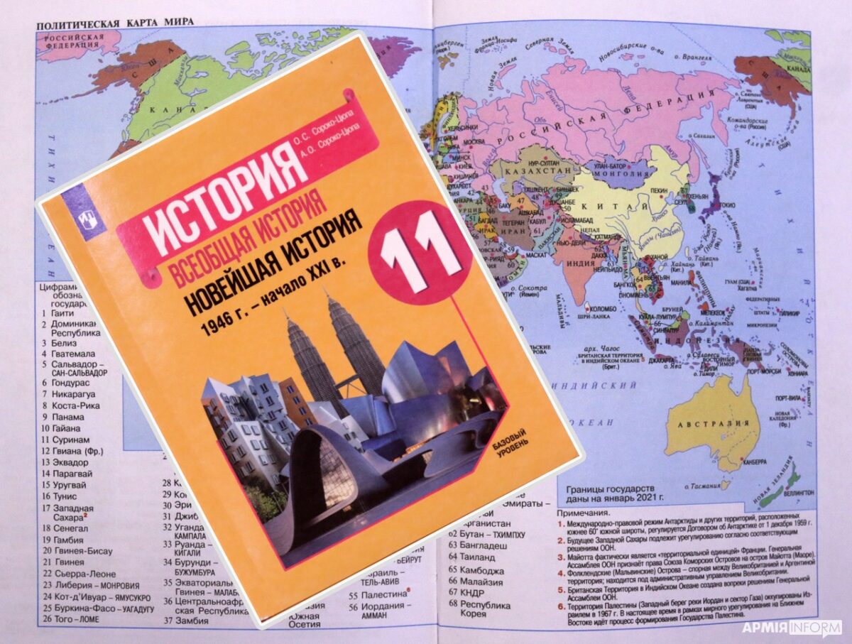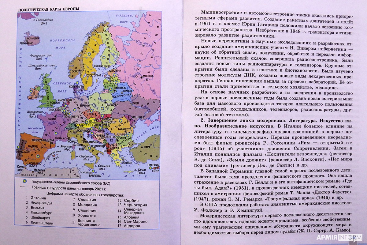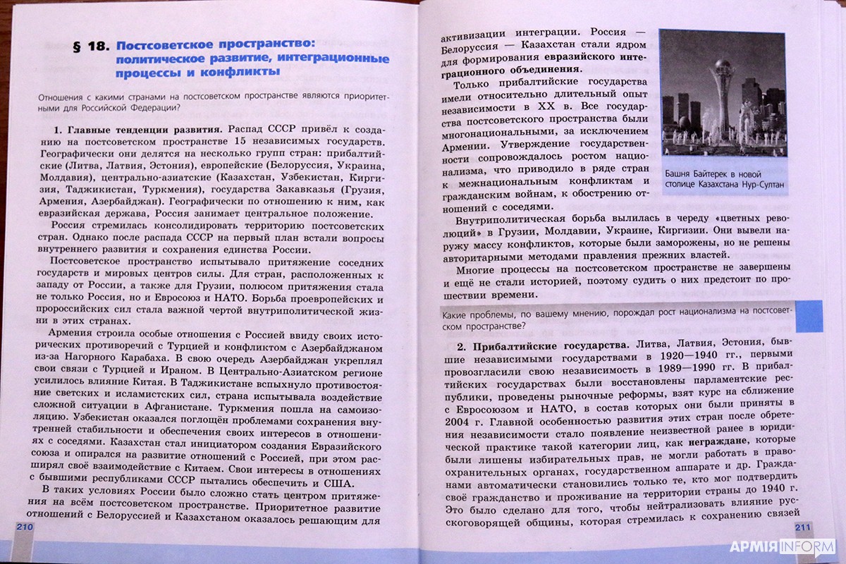 У виявленому в одній зі шкіл визволеної Куп’янщини російському підручнику 2022 року видання «История. Всеобщая история, 1946 г. — начало ХХІ века: 11 класс: базовый уровень» справді наявний параграф, у якому мало би йтися про Україну. Його назва: «Постсоветское пространство: политическое развитие, интеграционные процессы и конфликты», а головне мотто: «россия стремилась консолидировать территорию постсоветских стран. Однако после распада ссср на первый план встали вопросы внутреннего развития и сохранения единства россии». Погляньмо детальніше, про що і як саме там сказано.