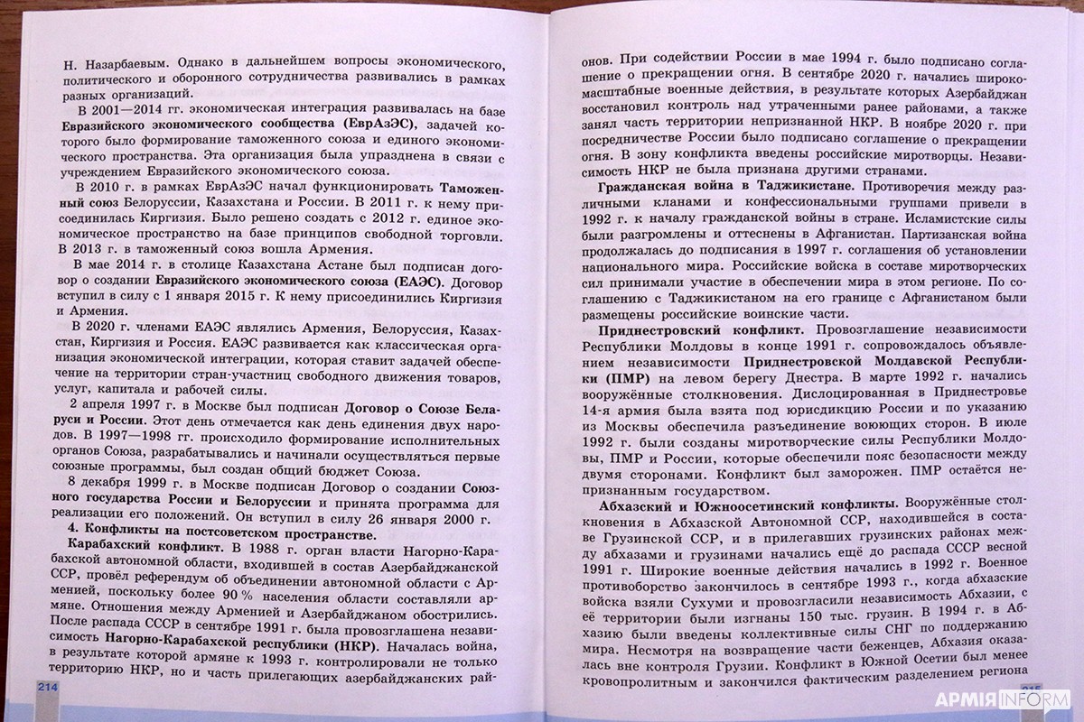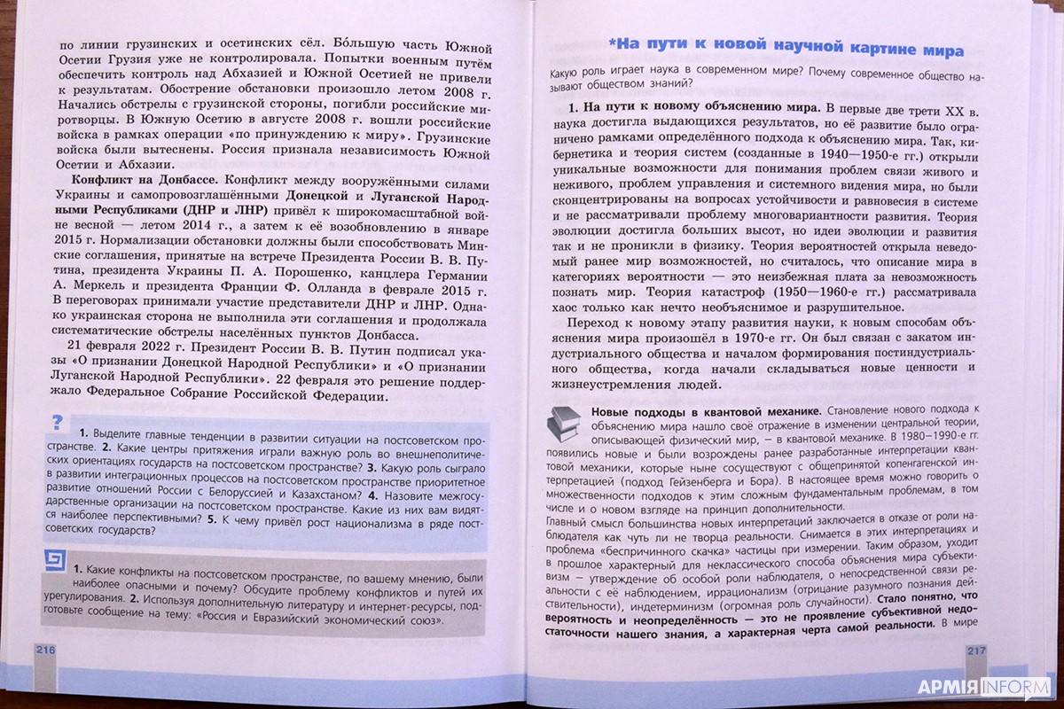 Останній абзац параграфа є, вочевидь, найсвіжішою інформацією на момент видання підручника: «21 февраля 2022 г. президент россии в. в. путин подписал указы „О признании донецкой народной республики“ и „о признании луганской народной республики“. 22 февраля это решение поддержало федеральное собрание российской федерации». Про «специальную военную операцию» у цьому підручнику не сказано нічого, хоча, як зазначено у вихідних даних книги, оригінал-макет було підписано до друку 15 липня 2022 року, тобто тоді, коли широкомасштабне вторгнення російської федерації в Україну тривало вже понад 4,5 місяці.