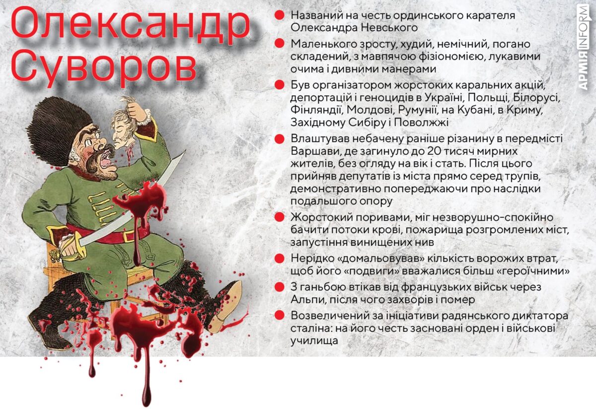 «То була людина маленького зросту, худа, немічна, погано складена, з мавпячою фізіономією, з лукавими очима і манерами до того дивними і сміховинно-кумедними, що не можна було бачити його без сміху або жалю… Жорстокий поривами, він міг незворушно-спокійно бачити потоки крові, згарища розгромлених міст, запустіння винищених нив», — так описував цього російського воєначальника французький король в еміграції Людовик XVIII. Проте в сучасній росії Олександр Суворов вважається «найвеличнішим полководцем, який не програв жодної битви». Чергова хвиля «возвеличення» Суворова здійнялася в росії після сумновідомої промови путіна 21 лютого 2022 року. А два тижні тому російська православна церква повідомила, що розгляне питання канонізації в лику святих «видатного російського полководця» (як неочікувано! — Авт.).