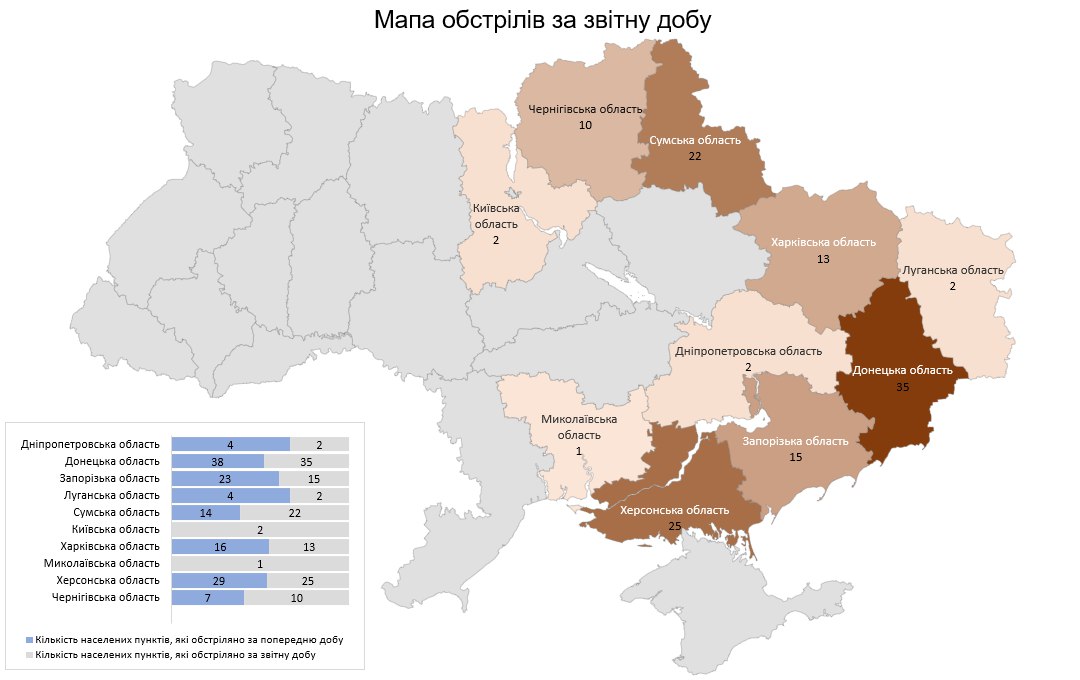 Загалом з різних видів озброєння —гранатомети, міномети, танки, артилерія, ПТРК, РСЗВ, ЗРК, ОТРК, БПЛА, тактична авіація — були атаковані 127 населених пунктів та 35 об’єктів інфраструктури.