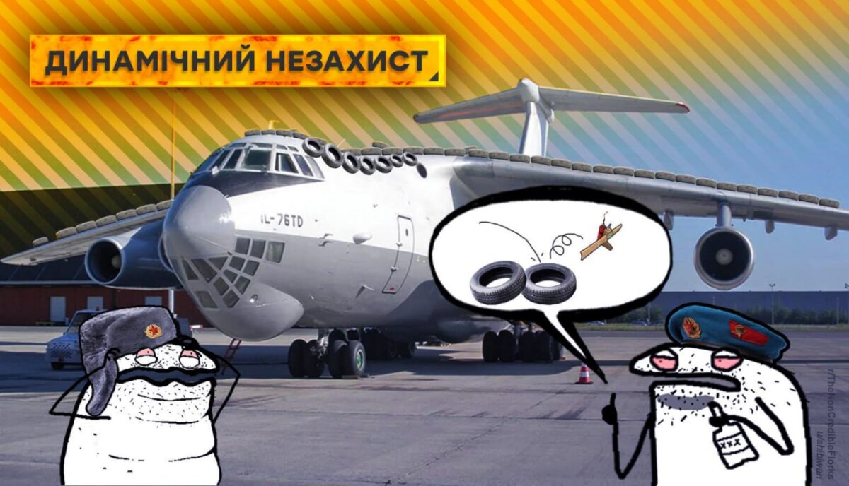 Ну і наостанок, давайте звернемо увагу на рояль у кущах: непереможна надсучасна мінус друга армія світу накриває свою навіть надсучасну авіацію покришками для захисту від літаючих коробок з Укрпошти.