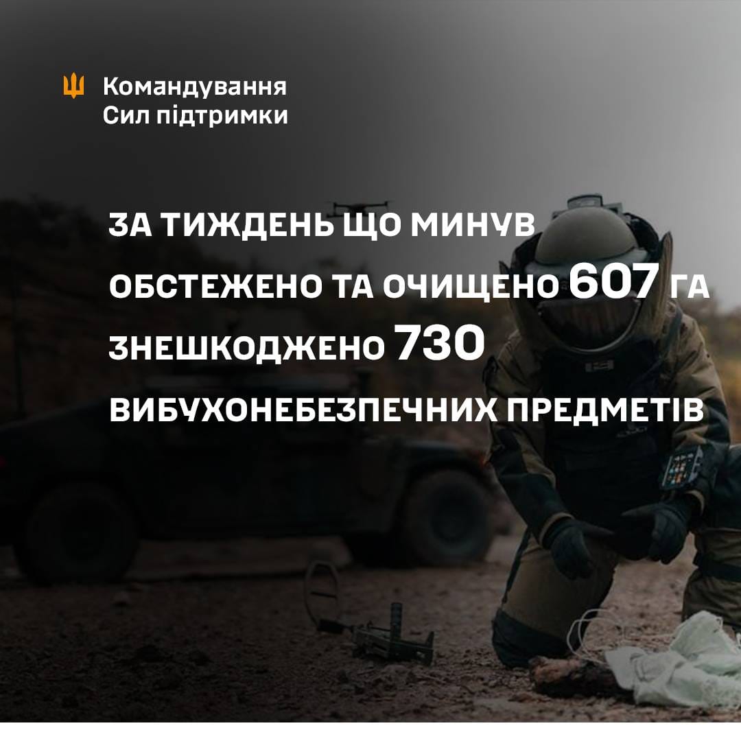 Протягом тижня, що минув, фахівцями Командування Сил підтримки Збройних Сил України обстежено та очищено від вибухонебезпечних предметів понад 607 га сільськогосподарських угідь, лісових масивів та інших територій, на яких вилучено та знешкоджено 730 вибухонебезпечних предметів”, — йдеться в повідомленні.