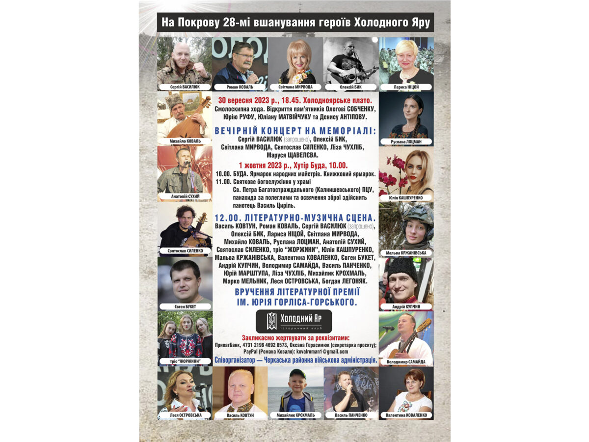 На літературно-музичній сцені: письменники Роман Коваль і Лариса Ніцой, народна артистка України Світлана Мирвода, заслужена артистка України Руслана Лоцман, кобзарі Михайло Коваль і Святослав Силенко, виконавці Сергій Василюк, Олексій Бик, Анатолій Сухий, Володимир Самайда, Юрій Марштупа і Ліза Чухліб, поети Василь Ковтун, Валентина Коваленко, Мальва Кржанівська і Юлія Кашпуренко, видавець Марко Мельник, акордеоніст Василь Панченко, юна скрипалька з Кам’янки Маруся Щавелєва, тріо «Жоржини», Михайлик Крохмаль, громадські діячі Леся Островська і Богдан Легоняк та інші.