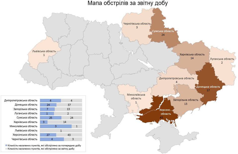 «Із різних видів озброєння — міномети, артилерія, танки, РСЗВ, ЗРК, ударних БПЛА, ОТРК, тактична авіація — були атаковані 142 населені пункти та 64 об’єкти інфраструктури», — йдеться у повідомленні.