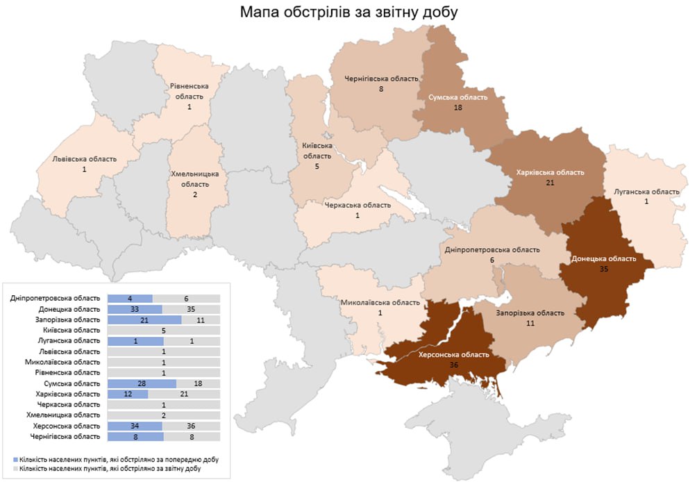 «Загалом з різних видів озброєння — гранатомети, міномети, танки, артилерія, РСЗВ, ударні БПЛА, ЗРК, стратегічна та тактична авіація — були атаковані 147 населених пунктів та 151 об’єкт інфраструктури», — йдеться у повідомленні.