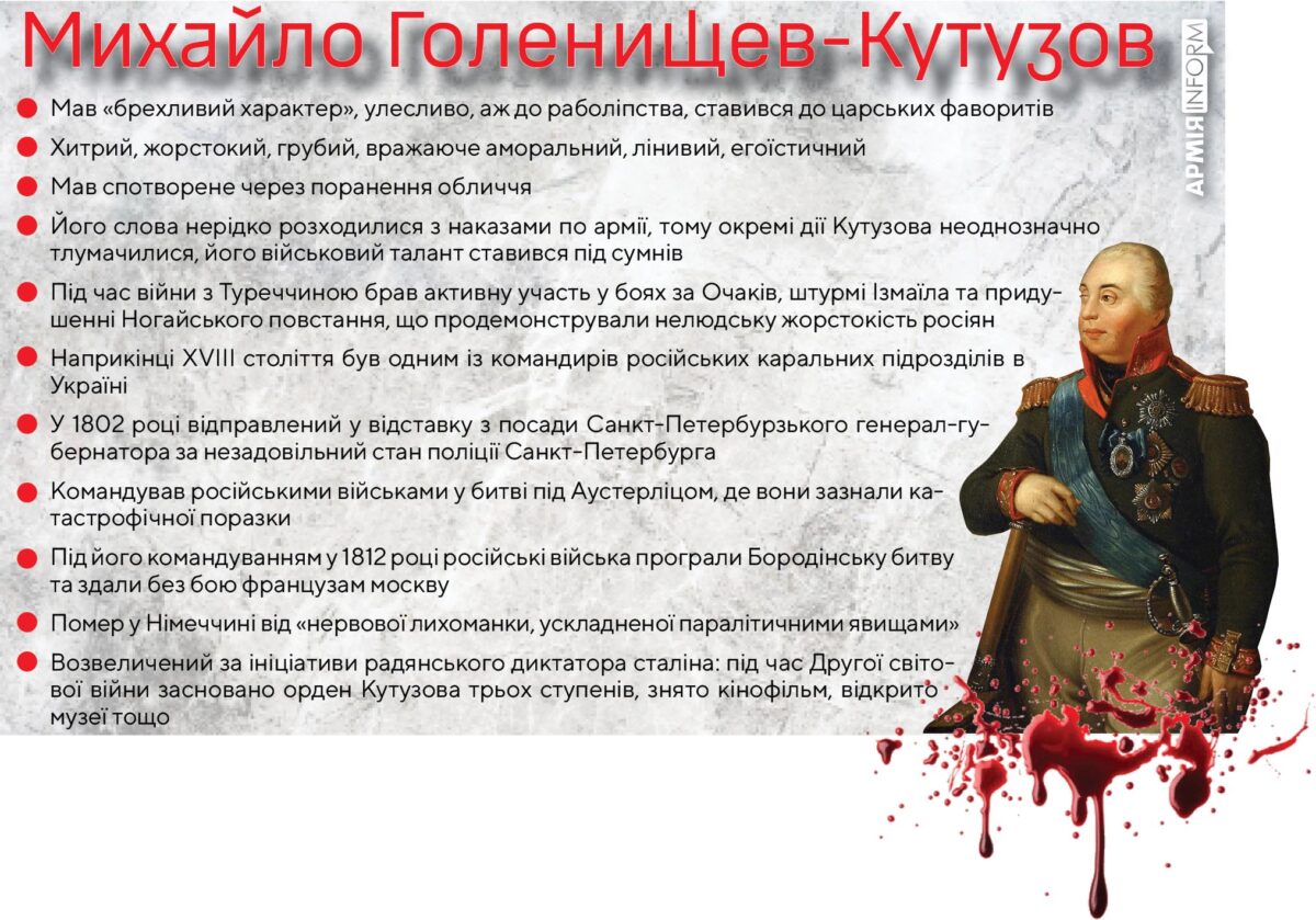 «За своїми стратегічними і тактичними обдаруваннями він не дорівнює Суворову, а Наполеону не дорівнює й поготів» — одна з найвідоміших характеристик російського полководця, який за життя мав славу хитрої, жорстокої, грубої, вражаюче аморальної, лінивої та егоїстичної особи. Він завжди улесливо, аж до раболіпства, ставився до царських фаворитів, хоча ті його недолюблювали через «брехливий характер» і спотворене пораненням обличчя. А втім, це дозволило Михайлу Голенищеву-Кутузову мати стрімку військову кар’єру.