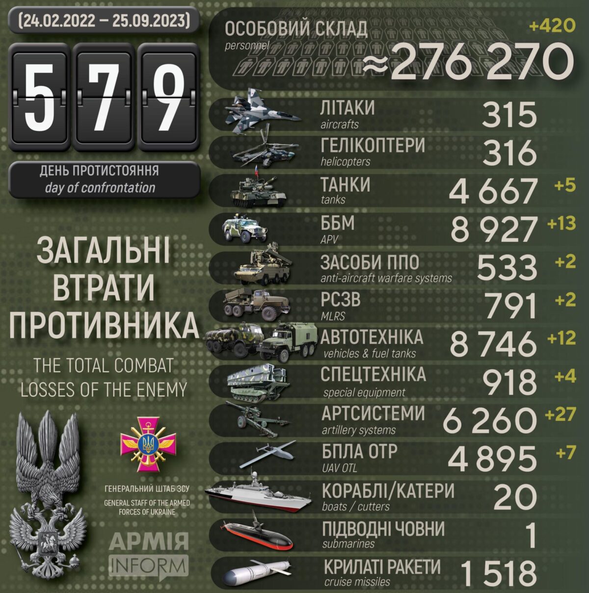 Джерело: Генеральний штаб Збройних Сил України станом на 25.09.23.