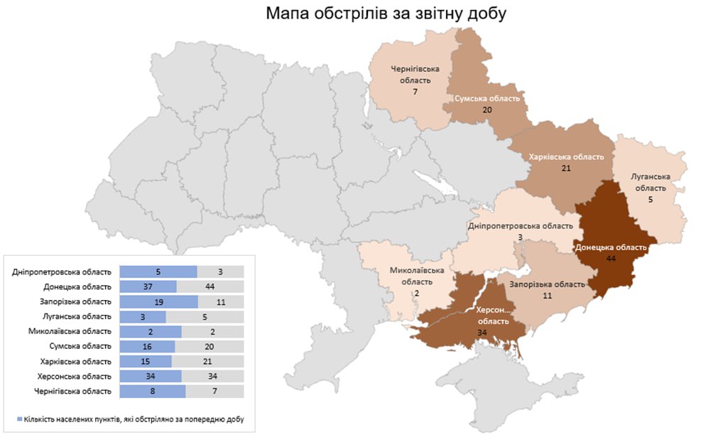 «Загалом з різних видів озброєння — гранатомети, міномети, танки, артилерія, РСЗВ, ЗРК, БПЛА та тактична авіація — були атаковані 147 населених пунктів та 99 об’єктів інфраструктури», — йдеться у повідомленні.