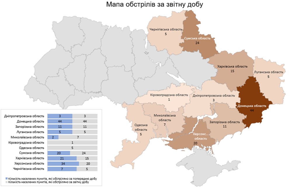 «Загалом з різних видів озброєння — гранатомети, міномети, танки, артилерія, РСЗВ, ЗРК, ОТРК, ударні БПЛА та тактична авіація — були атаковані 140 населених пунктів та 106 об’єктів інфраструктури», — йдеться у повідомленні.