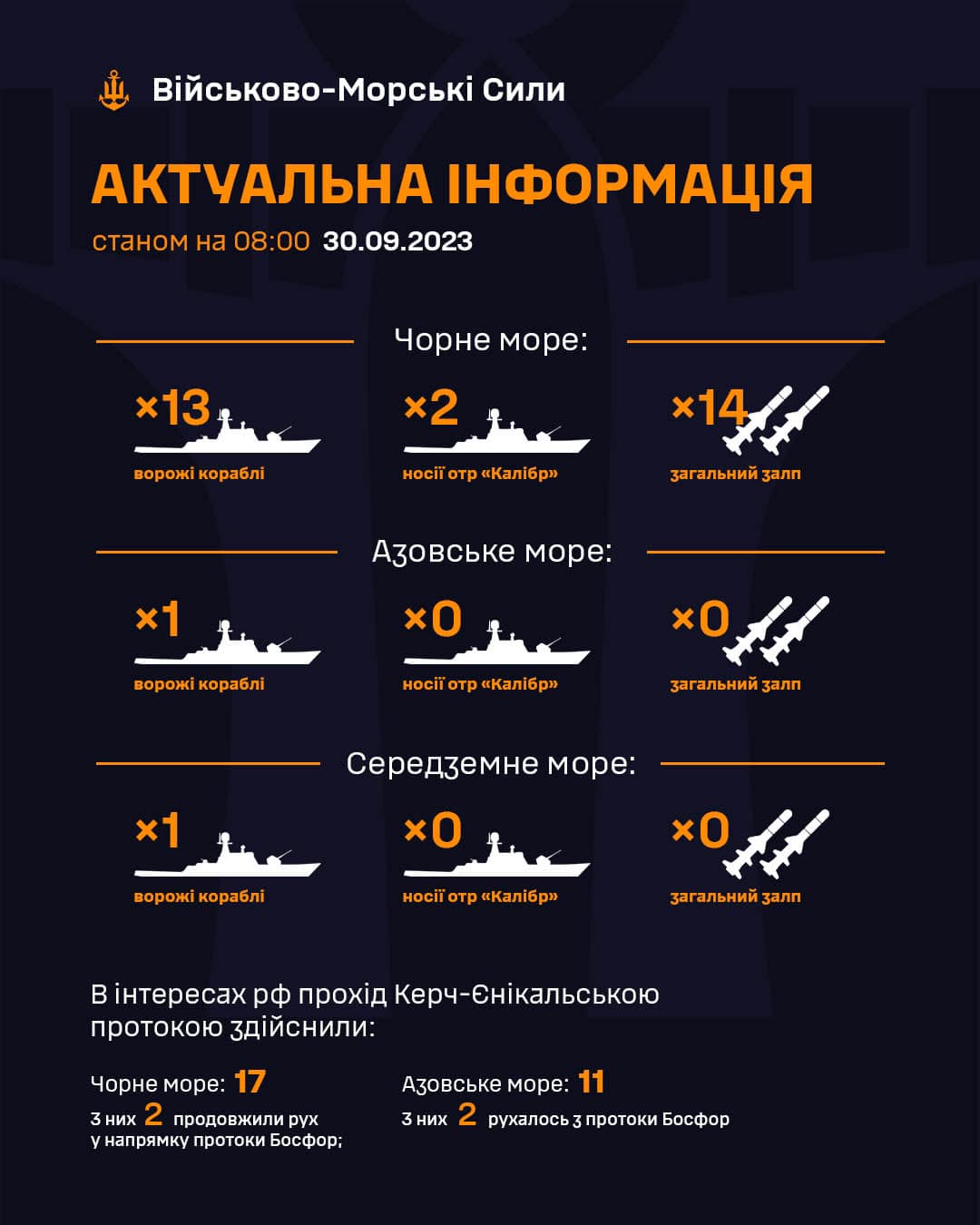 росія станом на 08:00 суботи, 30 вересня, тримає у Чорному морі на бойовому чергуванні 13 кораблів, з них два носії крилатих ракет «Калібр» загальним залпом до 14 ракет.