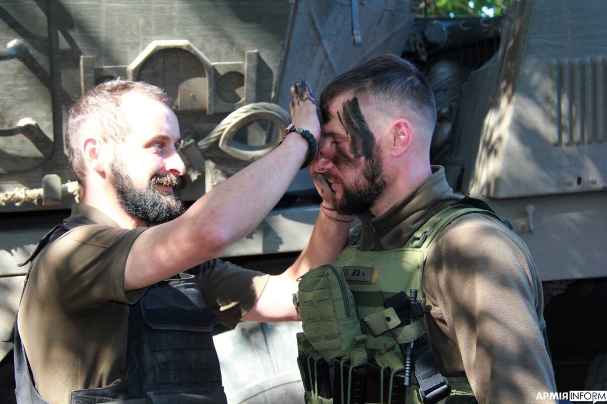 Після повернення на вихідну позицію бачимо, що в екіпажу гармати гарний настрій після виконаної роботи. Як з’ясувалося, вдалося гарно відпрацювати по ворожій піхоті. Є й ще одна причина для свята. Сьогодні один із зарядників став повноправним артилеристом, бо виконав перші в житті бойові стрільби. За артилерійською традицією, йому мажуть обличчя сажею від згорілого пороху, дають понюхати гільзу та символічно торкаються сідниць банником.