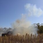 Ось і перша позиція. Гармата завмерла на краю поля, де колись висівали пшеницю, рідке колосся якої можна розгледіти в сухій траві. Екіпаж задраює люки та готується до стрільби. З цієї позиції наші воїни роблять кілька пристрільних пострілів, але виявляється, що метеоумови не дозволяють накрити ворога щільним вогнем.