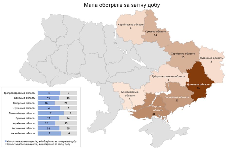 «Загалом з різних видів озброєння — гранатомети, міномети, танки, артилерія, РСЗВ, ЗРК, БПЛА та тактична авіація — були атаковані 132 населених пункти та 111 об’єктів інфраструктури», — йдеться у повідомленні.