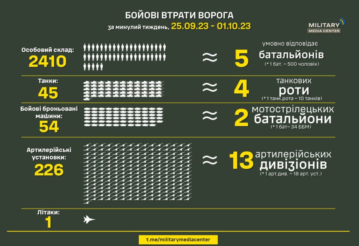Сили оборони України за минулий тиждень з 25.09 по 01.10 знищили: