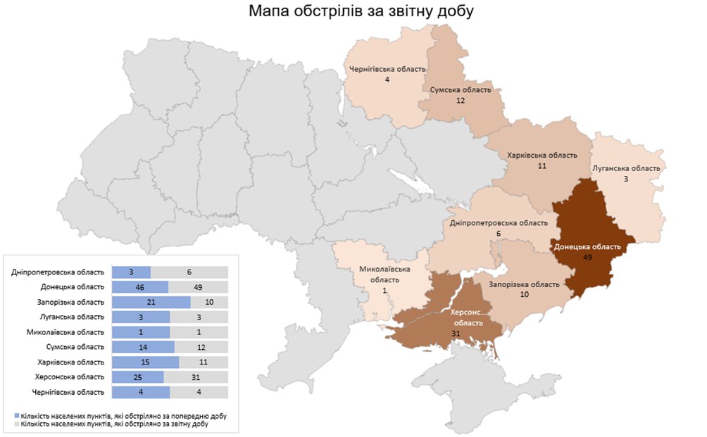«Загалом з різних видів озброєння — гранатомети, міномети, танки, артилерія, РСЗВ, ЗРК, БПЛА та тактична авіація — були атаковані 127 населених пунктів та 115 об’єктів інфраструктури», — йдеться у повідомленні.
